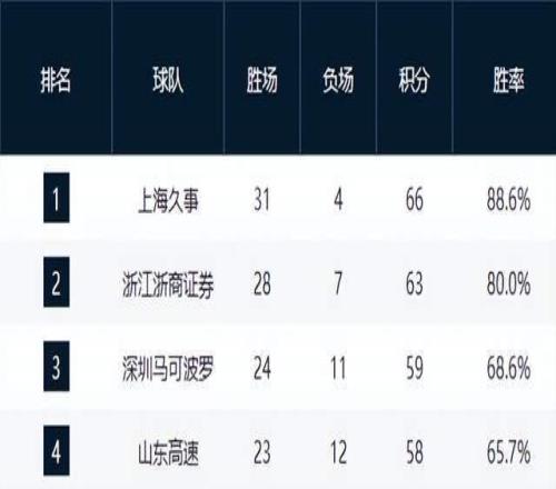 上海久事以32勝3負(fù)高居榜首,領(lǐng)先第二名浙江廣廈3個勝場,冠軍獎杯已近在咫尺。球隊攻防兩端穩(wěn)定性極強,核心球員狀態(tài)持續(xù)在線,基本鎖定本賽季常規(guī)賽頭名。廣廈雖同樣取勝,但與上海的勝場差距已難以彌補,爭冠希望渺茫,重心或?qū)⑥D(zhuǎn)向季后賽深度布局。
