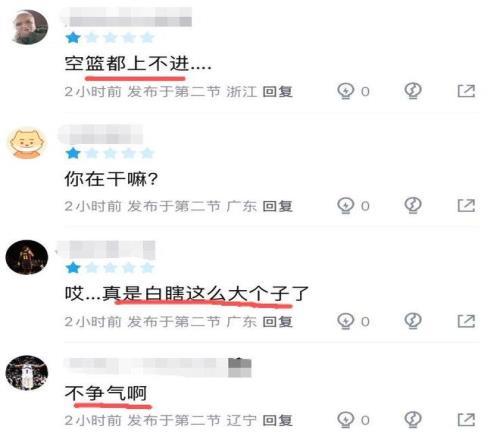 本輪遼寧以9分優勢擊敗福建的比賽中,吳昌澤替補出戰11分鐘,2中0,一分沒拿,全場僅有1個籃板。當初被視為“遼籃櫻木”的他,在剛上一隊的時候非常愛扣籃,但這場比賽,在有機會扣籃的情況下,吳昌澤卻并沒有選擇展現自己的彈跳能力。他這不爭氣的表現,也引起了球迷的吐槽:白瞎這么大個子了。