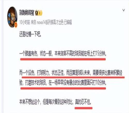 他說“還是吐槽一下吧。一個膝蓋有傷,狀態一般,本來效率不高的球員能在場上打15分鐘。而一個沒傷,打球努力,狀態正佳,而且算是球隊未來,需要很多比賽來積累經驗,打磨技術的球員,在一場早早沒有懸念的比賽里面只打10分鐘。本來不想扯這個,但是每次看到這種對比,真的忍不住”。其實別跑剛背豬是拿有傷的張皓嘉與沒傷狀態好的陳家政作出對比,張皓嘉打了近15分鐘只得5分,而只打10分鐘的陳家政得了9分,誰的表現好誰的效率高,不是一目了然嗎?你杜鋒就是作妖,別在這里扯什么困難了,正像球迷怒噴的那樣,你就是困難的最大制造機!諸位,你們認同這個觀點嗎?
