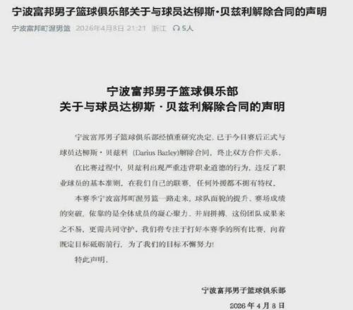 寧波隊絲毫不慣著,以貝茲利出現嚴重違背職業道德行為為由,直接讓他卷鋪蓋走人。