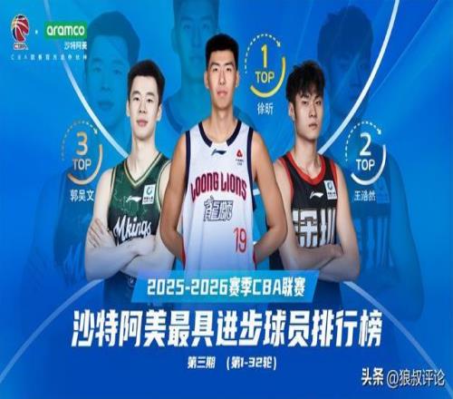 根據CBA官方的公示,2025-2026賽季CBA聯賽第1-32輪沙特阿美最具進步球員排名第一的是徐昕,隨后分別是郭昊文,王浩然。