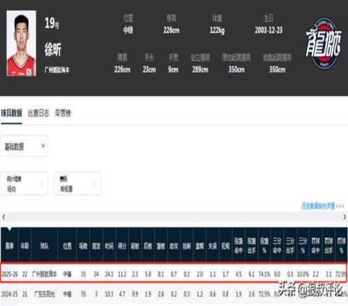 截止目前,徐昕代表廣州出戰35場比賽,場均24分鐘,得到11.2分8.1籃板2.0封蓋,投籃命中率為74.1%,各項數據均為生涯新高。
