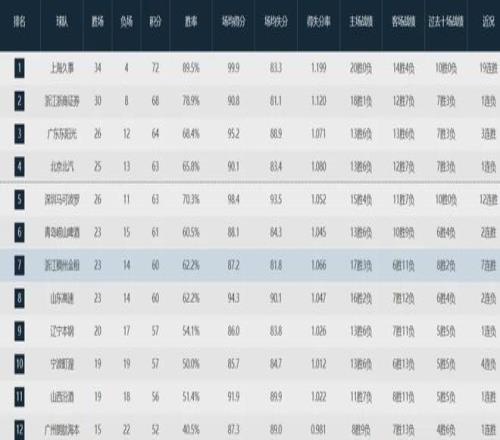 作為本賽季最有統治力的隊伍,上海隊迄今為止場均得分(99.9)、籃板(43.4)、助攻(23.9)、三分命中率(39.3%)、投籃命中率(52.8%)、投籃命中數(36.8)、百回合得分(126.5)、百回合失分(105.5)、百回合凈勝分(21.1)、有效命中率(59.9%),以及籃下命中率(73%)均高居聯盟榜首。