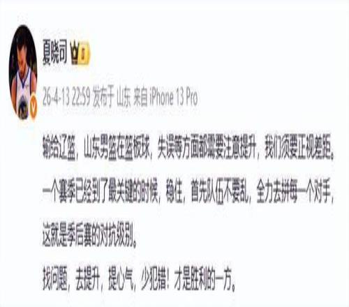 面對季后賽12進8的潛在對決,山東男籃與遼寧隊或將再度狹路相逢。媒體人夏曉司一針見血:“輸球不可怕,可怕的是輸得沒有方向。”他呼吁球隊“穩住陣腳、正視差距、少犯錯、提心氣”,這不僅是戰術層面的提醒,更是精神層面的警鐘。