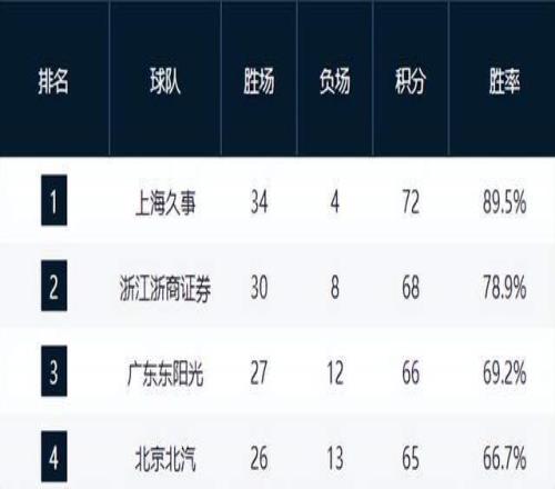 目前,上海久事以34勝4負的傲人戰績提前鎖定常規賽冠軍,并已取得19連勝,收官階段有望以全勝戰績收官。衛冕冠軍浙江廣廈以30勝8負位列第二,雖無緣榜首,但領先身后的廣東、深圳三場勝差,位置穩固。