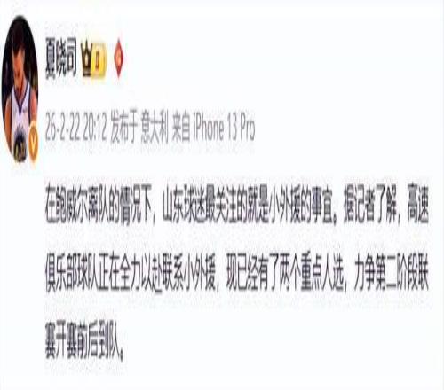 至于小外援?根據山東媒體人夏曉司的報道,山東男籃俱樂部已鎖定兩名重點目標,正全力推進簽約,目標明確:第二階段開賽前,必須到位。