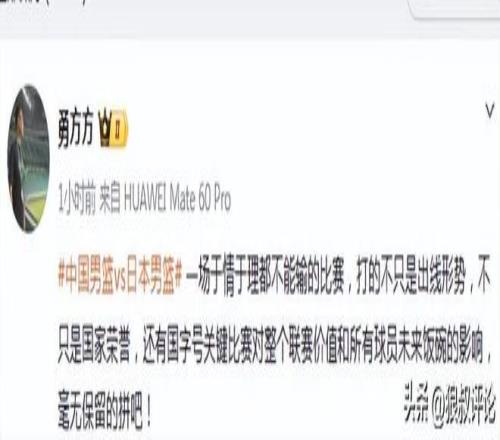 賽前,北京記者勇方方發(fā)文點(diǎn)評(píng):“中國男籃vs日本男籃,一場于情于理都不能輸?shù)谋荣悾虻牟恢皇浅鼍€形勢,不只是國家榮譽(yù),還有國字號(hào)關(guān)鍵比賽對(duì)整個(gè)聯(lián)賽價(jià)值和所有球員未來飯碗的影響,毫無保留的拼吧! ”