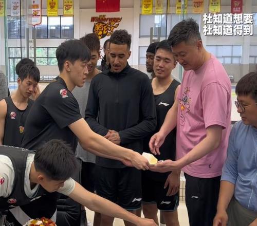 準(zhǔn)備活動(dòng)結(jié)束,杜鋒還是獲得了足夠的尊重。李文昊特地切了一塊蛋糕給杜鋒,這就是杜鋒在隊(duì)內(nèi)的地位。之前也出現(xiàn)過年輕球員給杜鋒切蛋糕的情況,他對(duì)于年輕球員的幫助還是比較大的。