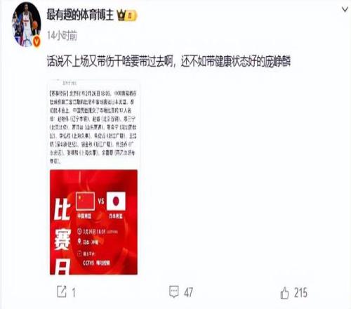 但是問題來,既然胡明軒達不到打比賽的要求,郭士強為何要帶上他?媒體人最有趣的體育博主,對此也非常不滿,直接噴郭士強,他說,“話說不上場又帶傷干啥要帶過去啊,還不如帶健康狀態好的龐崢麟”。媒體人說的非常有道理,既然胡明軒達不到比賽要求,為何要帶上他?帶上健康和狀態均好的龐崢麟不比胡明軒好嗎?可見郭士強的操作就是作死,膽子還是小了一點,人也太固執了,不少人認為龐崢麟是最適合打日本隊的隊員,他速度快,既能突破又有三分,對方對他也不了解,為何不能膽子大一些帶上他?