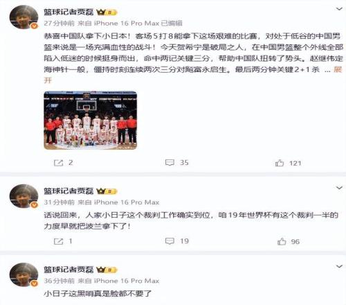 籃球記者賈磊老師更是怒斥裁判黑哨,“小日子這黑哨真是臉都不要了!話說回來,人家小日子這個裁判工作確實到位,咱19年世界杯有這個裁判一半的力度早就把波蘭拿下了!”