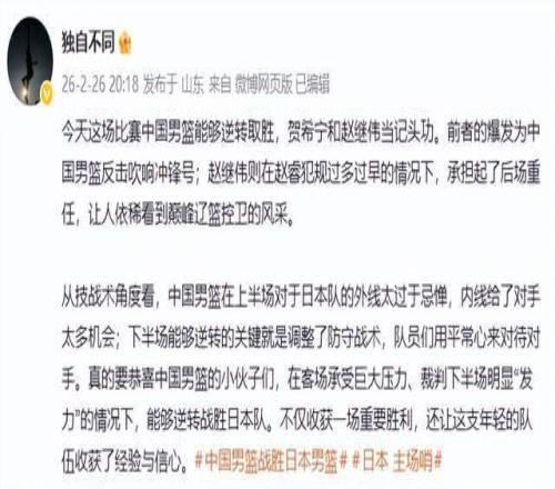 “中國男籃在日本打出了一場精彩的逆轉戰,從上半場最多落后15分,到下半場打出54-33,有點長沙亞錦賽逆轉韓國隊那味兒了。上下半場判若兩隊,關鍵在第三節首發上了廖三寧,與賀希寧一起,雙寧聯手打出良好進攻開端,14-0抹平分差。中國隊的三分球下半場進了7個,其中賀希寧、趙繼偉、高詩巖膽大手準,外線一開,由此打開了胡金秋的攻筐火力,下半場得了12分……在防守上,中國隊改善了擋拆防守,不過度防對手三分,對手后兩節也只進了3個三分……中國隊不缺拼勁,就是進攻差,想贏怕輸,防守用力過猛,犯規太多,上半場投得不好,差得甚至不敢投。下半場變換了用人,增加了“雙寧”的進攻,一順百順……最后的3罰一擲也是沒誰了……當然,困難越大越能提醒環境惡劣,祝中國隊借這一場徹底打開信心,下一戰輕松拿下臺北。”