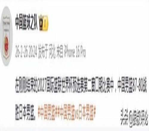 中國籃協(xié)官方社媒賽后更新社媒發(fā)文:在剛剛結(jié)束的2027國際籃聯(lián)世界杯預(yù)選賽第二窗口期比賽中,中國男籃87-80戰(zhàn)勝日本男籃。