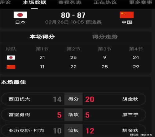 看了直播的球迷都知道,中國男籃比賽一開始進入狀態慢熱,反觀日本隊占據主場優勢,可以說進入狀態是很快的,首節比賽中國男籃11比21輸給了日本男籃十分。第二節中國男籃逐漸進入狀態,反饋日本男籃這邊可以說狀態依舊是火熱,中國男籃一直處在追分的狀態,第二節戰罷中國男籃22:26,半場結束,中國男籃落后日本男籃14分。