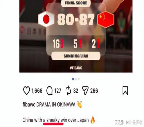 而就在今天凌晨,國際籃聯官網在戰報中用中國隊“從日本偷走一場勝利”來形容這場比賽的結果。這一表述引發了球迷的極大憤慨。中國隊是在客場完成翻盤,用“偷”來形容顯得格外刺耳。國外論壇同樣有聲音質疑這一措辭是否失當。幾個小時后,國際籃聯官網將這段文字改為“下半場完成逆轉并帶走勝利”。