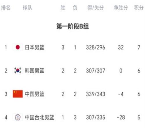 B組四輪過后,日本隊(duì)3勝1負(fù)穩(wěn)居第一,韓國隊(duì)、中國隊(duì)都是2勝2負(fù),中國隊(duì)凈勝分落后4分,仍然排名第三,中國臺北隊(duì)1勝3負(fù)穩(wěn)居墊底。盡管排名沒有變化,但晉級形勢再度有變,中國隊(duì)形勢柳暗花明。
