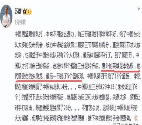 賽后蘇群夸他是意外的英雄。他發文寫道,“中國男籃跟省隊打,本來不用這么費力,前三節進攻打得非常不好,給了中國臺北隊太多的反擊機會,核心中鋒胡金秋第二和第三節都沒有得分,直到第四節才大放光彩,也得益于中國臺北隊只有7個人打球,最后體能都不行了。到了第四節,中國隊才打出自己的特點,趙繼偉那個超遠三分是轉折點。意外的英雄是李弘權,他代替受傷的朱俊龍,最后一節搶了5個籃板球。”李弘權是中國隊今天最大的驚喜和英雄。你們說呢?