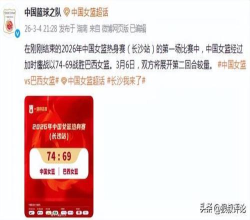 賽后,中國籃協(xié)官方社媒發(fā)文:在剛剛結(jié)束的2026年中國女籃熱身賽(長沙站)的第一場比賽中,中國女籃經(jīng)過加時鏖戰(zhàn)以74-69戰(zhàn)勝巴西女籃。3月6日,雙方將展開第二回合較量。