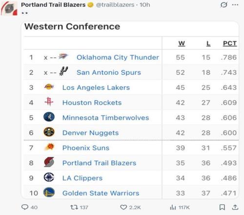 開拓者拿到三連勝,而快船吞下4連敗,勇士隊(duì)最近的21場比賽輸?shù)袅?6場,開拓者已經(jīng)反超快船升至西部第八,開拓者已經(jīng)領(lǐng)先勇士1.5個(gè)勝場,開拓者近來狀態(tài)真的不錯(cuò)。