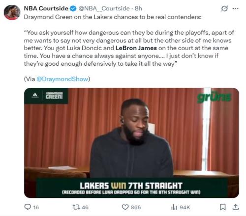 追夢格林在評價(jià)如今這支湖人時(shí)他的說法是東契奇、詹姆斯讓湖人變得危險(xiǎn),他的原話是:你會問他們在季后賽能有多危險(xiǎn),一方面我會覺得他們可能沒那么危險(xiǎn),但另一部分的我知道事情沒那么簡單。當(dāng)東契奇和勒布朗同時(shí)在場上時(shí),你對任何對手都始終有機(jī)會……”