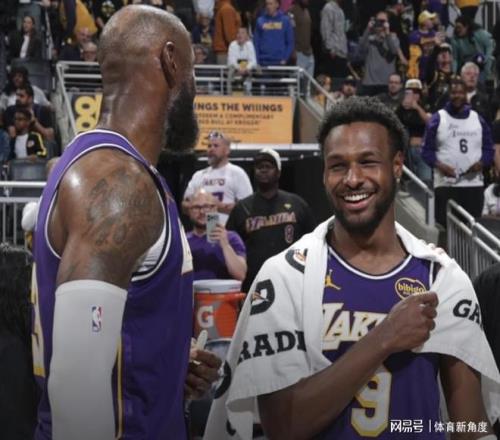 周三比賽的下半場,湖人隊主教練雷迪克的換人名單上,赫然寫著兩個名字。此時,兩位湖人球員并肩站立在記錄臺前。右側(cè)的球員,注于比賽,努力平復(fù)急促的呼吸,將全部精力聚焦于當(dāng)前的任務(wù):穩(wěn)固防守、全力以赴、保持進(jìn)攻的侵略性。而左側(cè)的球員,則盡情沉浸在這一刻的溫馨之中——這份醞釀多年的獨特父子情誼,是NBA其他隊友間從未有過的。兩人身體微微后仰,倚靠在記錄臺頂端的藍(lán)色軟墊上,靜靜等待著入場哨聲的響起。他們不約而同地以相同雙臂。