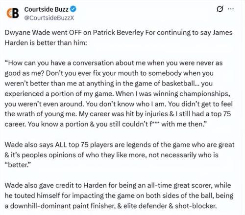 韋德也肯定了哈登是歷史級得分手,同時強調自己是攻防一體的球員:擅長沖擊內線終結、頂級防守者,還具備出色的蓋帽能力。