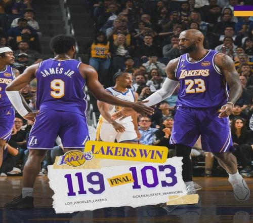 三節打完,湖人82-73領先勇士9分。第四節開始,詹姆斯送出單手滑翔劈扣,湖人一舉領先到20分以上。勇士又傷一人:克賴爾落地時踩在范德彪的腳上,克賴爾嚴重崴腳,被攙扶離場。全場結束,湖人119-103大勝勇士16分。