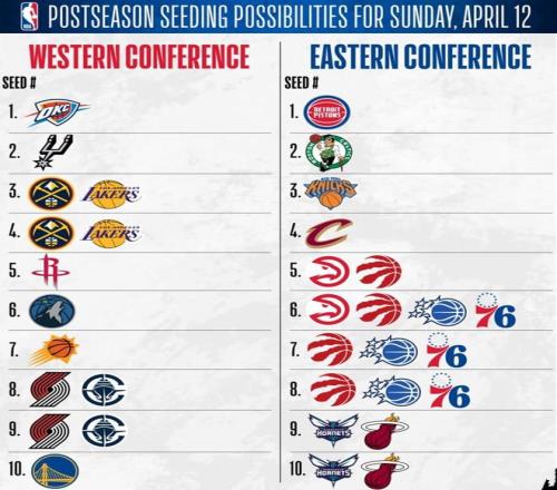 在常規賽收官戰即將開打之際,NBA官方也曬出最終東西部前十排名可能性分析,所有具體排名情況如下: