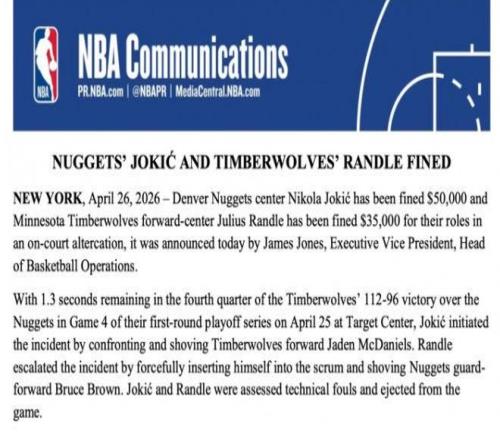 如今NBA官方公布處罰公告,約基奇被罰款3.5萬美元,原因是他主動挑起事端。至于蘭德爾被罰款3.5萬美元,原因是他參與沖突激化矛盾,而麥克丹尼爾斯沒有被處罰。