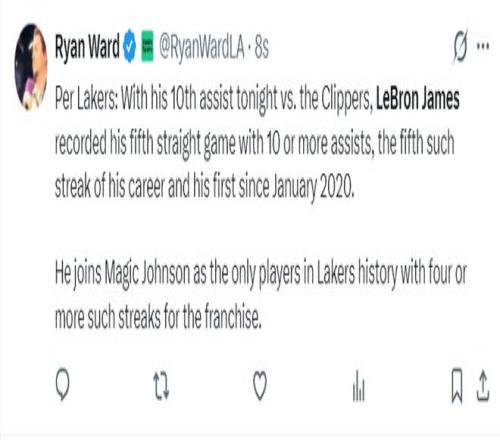 此役詹姆斯完成連續(xù)5場比賽10+助攻生涯第五次,也是自2020年1月份后首次,更是與魔術(shù)師并列湖人隊史僅有兩位至少4次連續(xù)五場助攻上雙的球員。