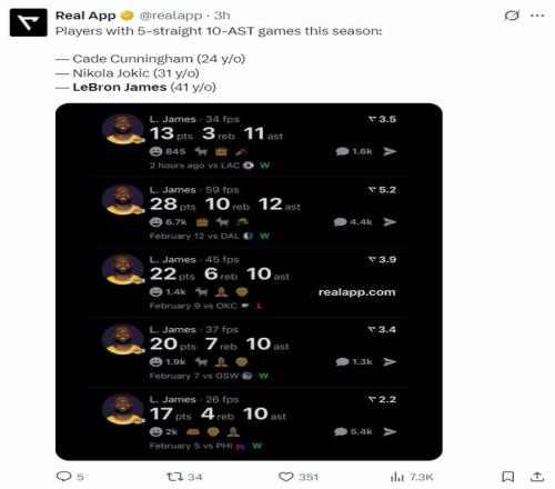 3.詹姆斯本賽季首次連續(xù)五場(chǎng)得分+助攻都上雙;