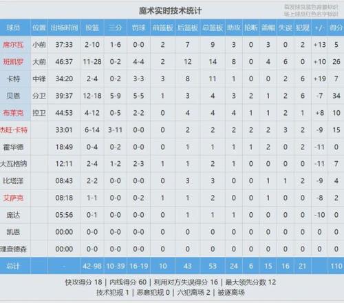 再看看魔術這邊,貝恩是全隊狀態最好的,無奈第一個加時賽6犯離場。本場比賽,貝恩18投12中,三分9中5,罰球5中5,砍下34分4板3助2斷!魔術狀元班凱羅28投11中,三分2中0,罰球4中4,拿到26分14板8助4帽6失誤。