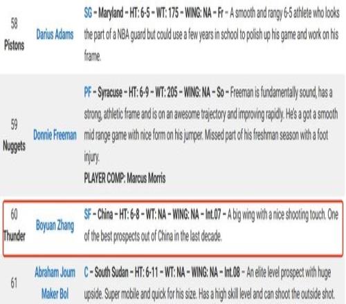 據(jù)美國(guó)選秀媒體NBA Draft Room的最新2027年NBA選秀預(yù)測(cè),張博源將會(huì)在第六十順位,也就是第二輪最后一位被雷霆隊(duì)選中。
