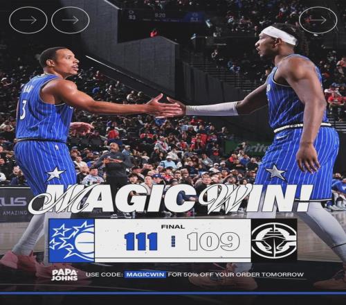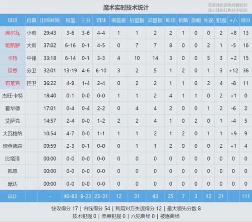 魔術暫停,前場邊線球,尼德豪澤這次成功扇飛貝恩的上籃。快船手握絕殺機會,不過泰倫盧并未叫暫停,最后2秒鐘,小卡被夾擊分給馬瑟林。機會確實出來了,可惜馬瑟林絕殺三分不中。全場結束,魔術111-109險勝快船。