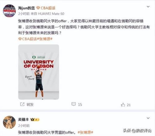 媒體人“海jun的藍”發文點評:張博源收到俄勒岡大學的offer,大家覺得以林葳目前的境遇和在俄勒岡的容錯率,這對張博源來說是一個好選擇嗎?俄勒岡大學主教練相對保守和傳統的打法有利于張博源未來的發展嗎?