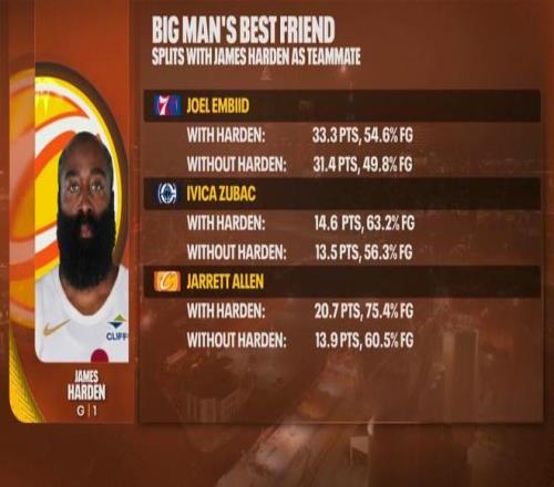 并且這樣的現象并非偶然,過去數個賽季與哈登搭檔的內線球員在數據與效率方面均有提升,從76人的恩比德到快船的祖巴茨,再到如今騎士的艾倫一直如此。