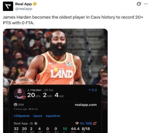 憑借這樣的表現,36歲零183天的哈登成為騎士隊史上單場0罰球情況下砍下20+最老的球員。