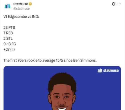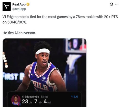 同時埃奇庫姆的效率要更加出色,本場已經是其新秀賽季第3次以180俱樂部命中率(50/40/90)砍20+,成功追平艾弗森并列76人隊史第一。