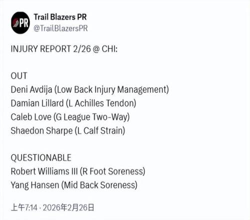 北京時間2月26日,開拓者已經召回楊瀚森,并更新了他的傷情。明日出戰公牛的狀態是出戰成疑(50%上場可能),他的傷病...