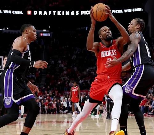第一位是威少,燃盡自己,輸球也可以昂首離開。威少的斗志毋庸置疑,威少遇見大哥杜蘭特往往能迸發出更加驚人的戰斗力。此役,威少首節就給杜蘭特和火箭隊一個下馬威,單節獨砍17分+3籃板,作為對比,國王全隊首節僅砍下22分。全場比賽下來,威少出戰25分鐘,19投10中(三分球7中1),罰球1中1,空砍22分+5籃板+3助攻。威少無懼歲月無懼風,可他確實不足以憑借一己之力改寫國王隊慘負老東家的命運。