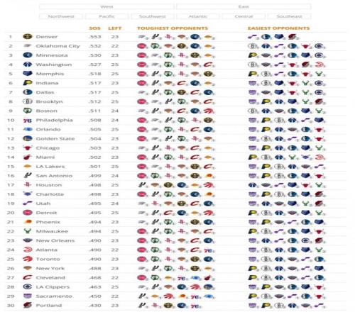 其中掘金與雷霆難度高居前二值得關注,尤其是考慮到兩支球隊還將3次正面相遇,這三場比賽的結果不僅將影響兩隊潛在對決的心理優勢,也將極大影響西部最終的排名局勢。