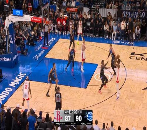 ——剩下8分鐘前,貝恩三分,火箭落后3分,杜蘭特馬上還了一記三分追平
