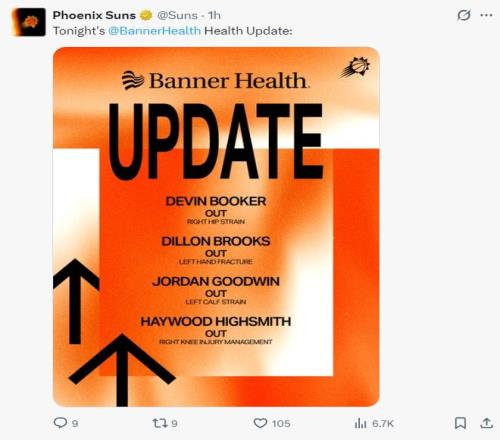 太陽這邊布克、狄龍、古德溫、海史密斯都無法登場(chǎng)。