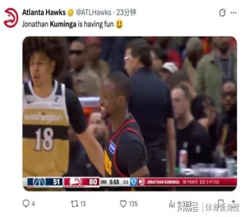 全場24分鐘轟下27分7板4助2斷,75%的命中率亮瞎眼!更絕的是,這孩子從第一球開始就咧著大白牙傻笑,活像中了彩票的二哈勇士那會兒,庫明加最高分才25分,還"你們逼我上班"的苦瓜臉。如今在老鷹,這笑容比亞特蘭大的陽光還燦爛,連場邊賣熱狗的大叔都打趣:"這小子怕不是把快樂基因注射到籃球里了!"