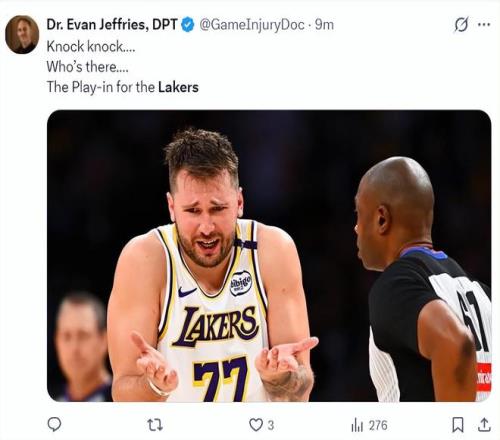 埃文-杰里弗斯曬出東契奇攤手的一幕寫道:敲門,誰在那兒?湖人的季后賽對決嗎?