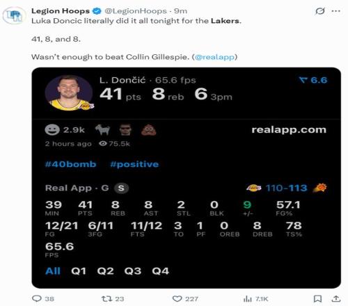 美媒曬出東契奇此役39分鐘,21中12,三分11中6,拿到41分8籃板8助攻2搶斷,命中率57.1%的數據寫道,還不足以擊敗吉萊斯皮。
