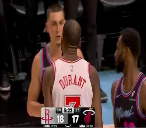 火箭遭熱火逆轉(zhuǎn)終結(jié)3連勝杜蘭特32+6+8沖突吃T阿門20+11
