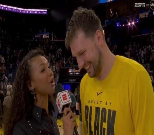 此役正值東契奇27歲生日夜,賽后東契奇在場邊接受了ESPN的采訪,女記者問到東契奇,“盧卡,謝謝你!還沒祝你生日快樂呢,別想著就這么開溜,感覺如何?我們聽到了你的隊友們在為你唱生日歌,他們送你什么禮物了嗎?”