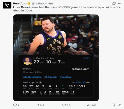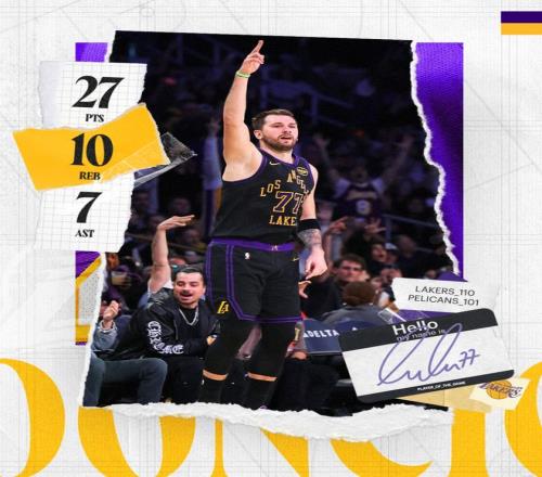 東契奇此役再度創(chuàng)造紀(jì)錄,在2026年?yáng)|契奇20次20+5+5聯(lián)盟第一,單賽季14次拿到25+10+5是湖人隊(duì)史2001年奧尼爾后首人。