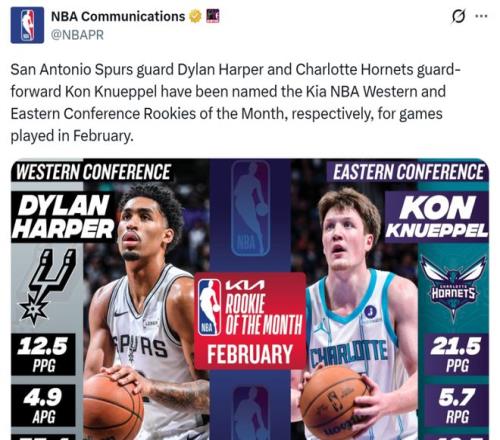 值得一提的是,在本場比賽開始前,克努佩爾才當(dāng)選2月份月最佳新秀,2月份他場均可以拿下21.5分5.7板,三分命中率48.5%。