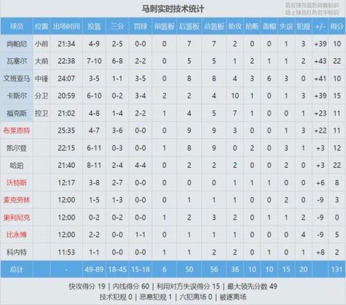 瓦塞爾出戰(zhàn)23分鐘,投籃10中7,三分8中6,罰球2中2,砍下22分5板1助2斷1帽,正負值+43全場最高。瓦塞爾+43高居隊史第二,僅次于鄧肯的+45。哈珀22分2板2助、卡斯爾15分4板10助、文班亞馬10分8板4助3斷6帽。